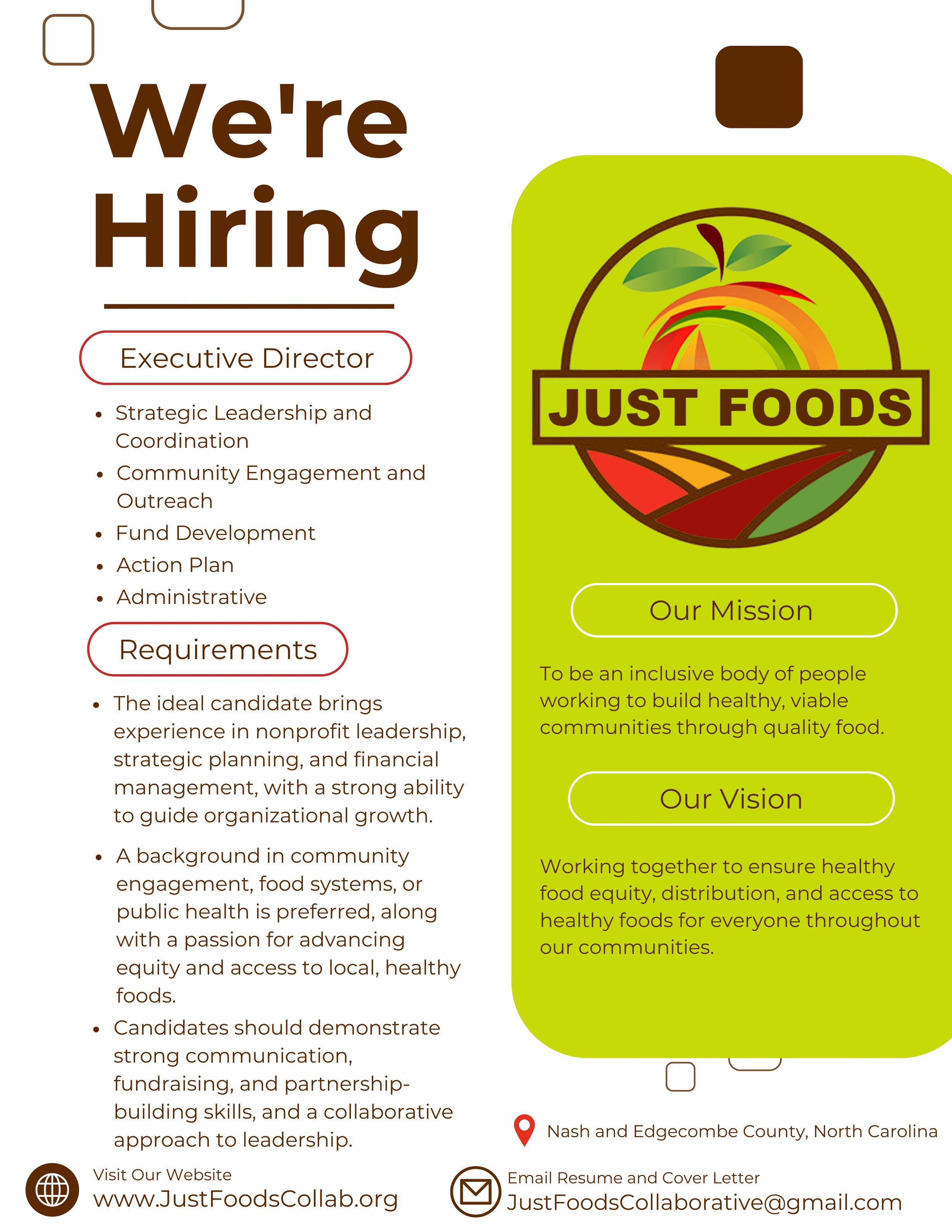 Just Foods is growing, and we’re looking for the right person to help lead the way. We’re officially hiring for an Executive Director to guide our next chapter of community impact across Edgecombe and Nash Counties. The ideal candidate will bring a passion for food access, local agriculture, and community building, along with experience in nonprofit leadership, fundraising, and collaborative partnerships. This is an exciting opportunity to lead a mission-driven organization working to strengthen our local food system, from supporting farmers and community gardens to connecting families with fresh, healthy food.